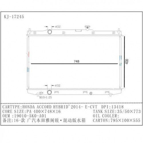 RADIADOR HONDA ACCORD HYBRID E-CVT 2014- 17245 19010-5K0-A01 400X748X16